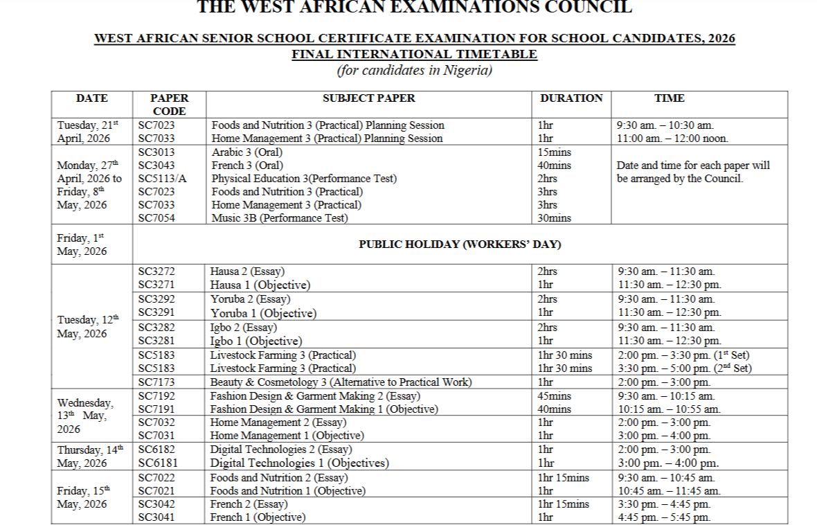 The West African Examinations Council (WAEC) has released the official timetable for the 2026 West African Senior School Certificate Examination (WASSCE) for school candidates.